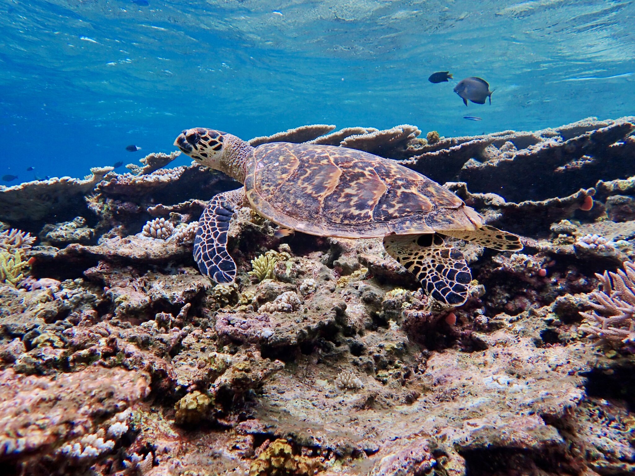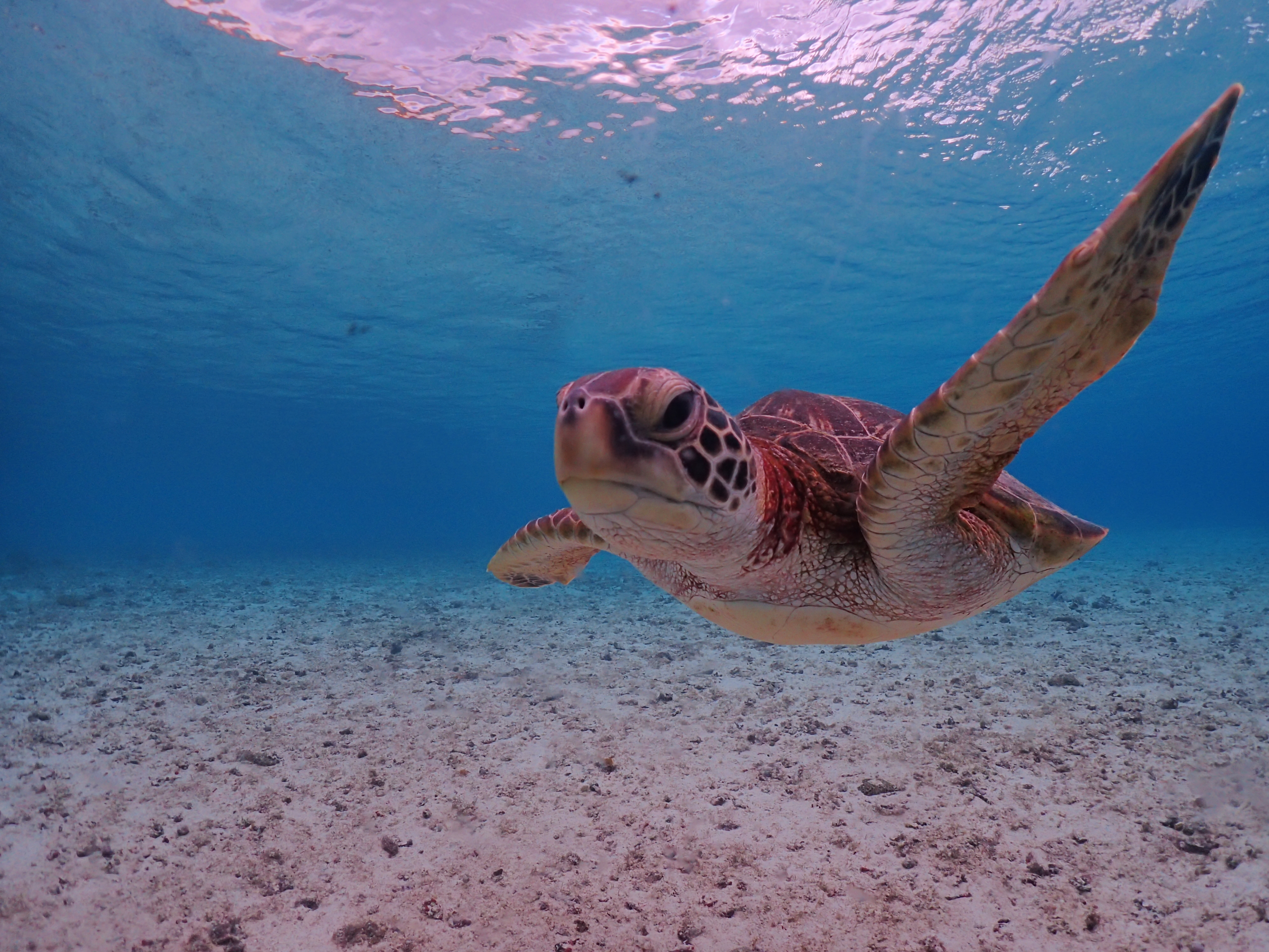ウミガメの好む海藻が育っている水深の浅い餌場が野生のウミガメたちとの遭遇率が高いポイント。