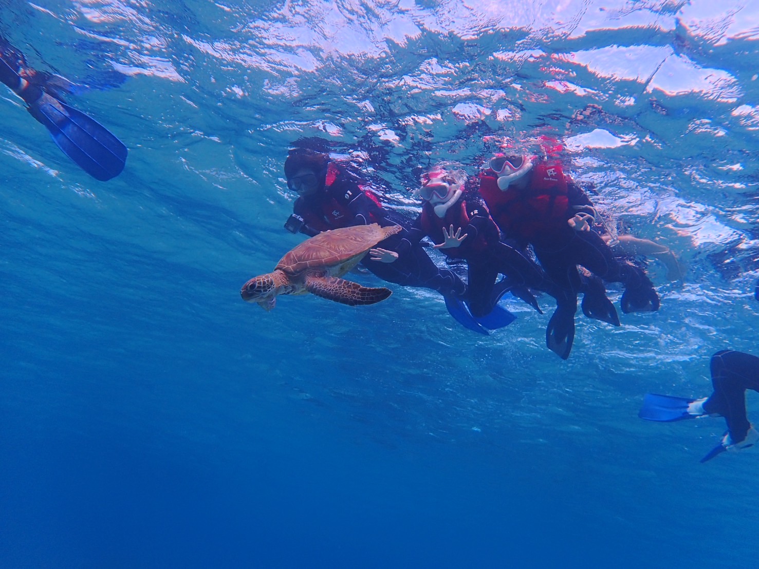 アクアベースのウミガメツアーは、岸から近くの波の穏やかなウミガメの餌場で開催。