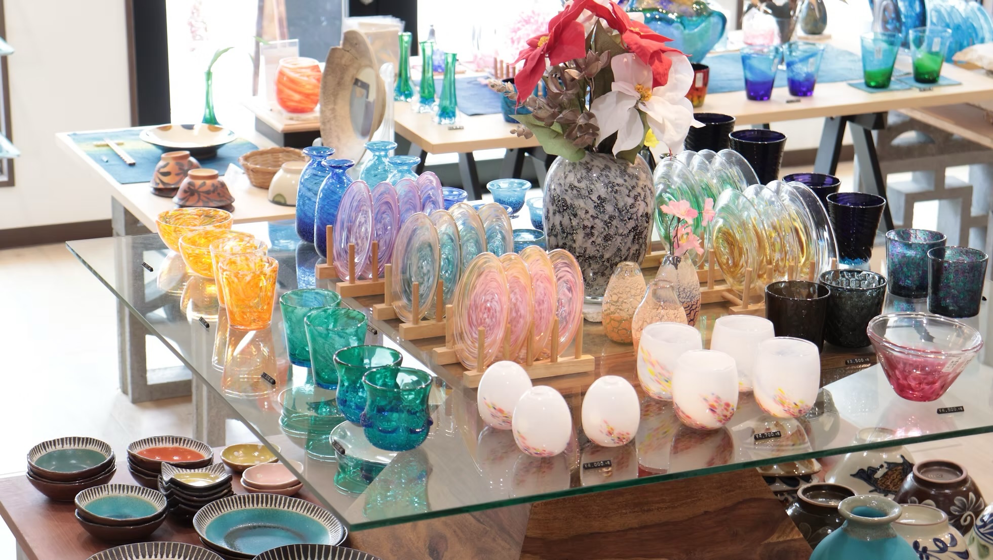 ここは名前の通り琉球ガラスを扱うお店で、お皿やグラス、箸置き、花瓶などなど沢山の種類の琉球ガラスがあります!
