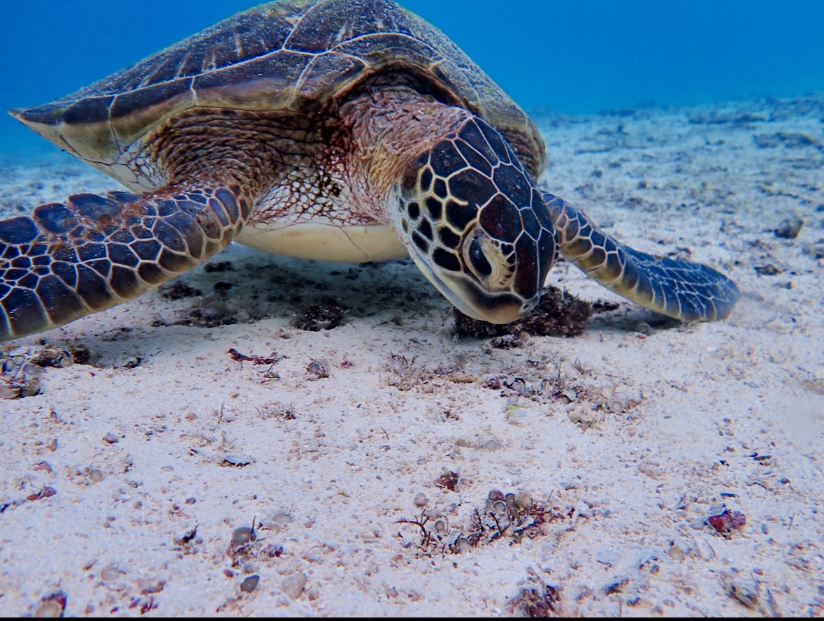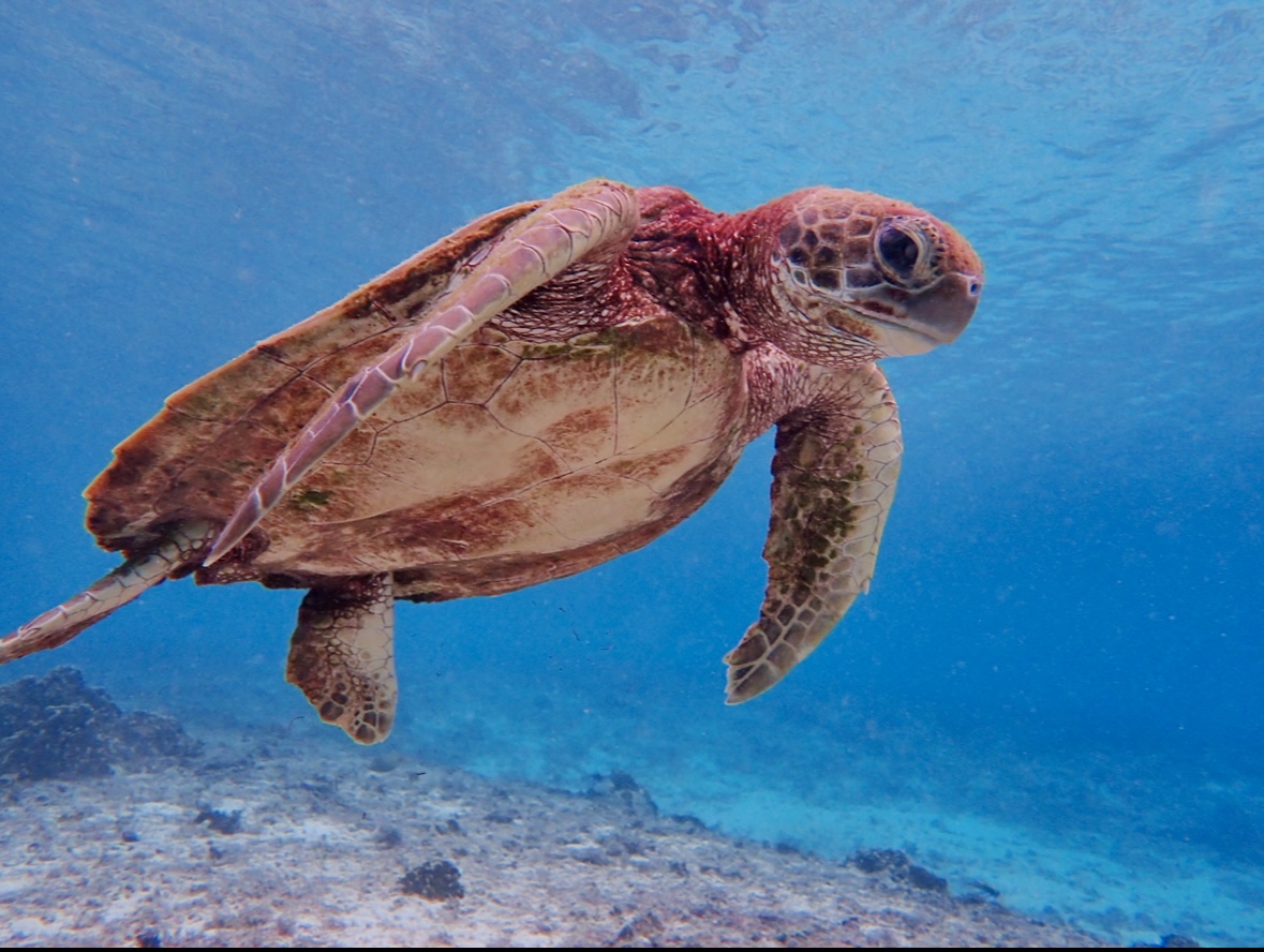 特にアオウミガメは、海草や海藻を食べるため、エサ場の近くにいることが多いです!
