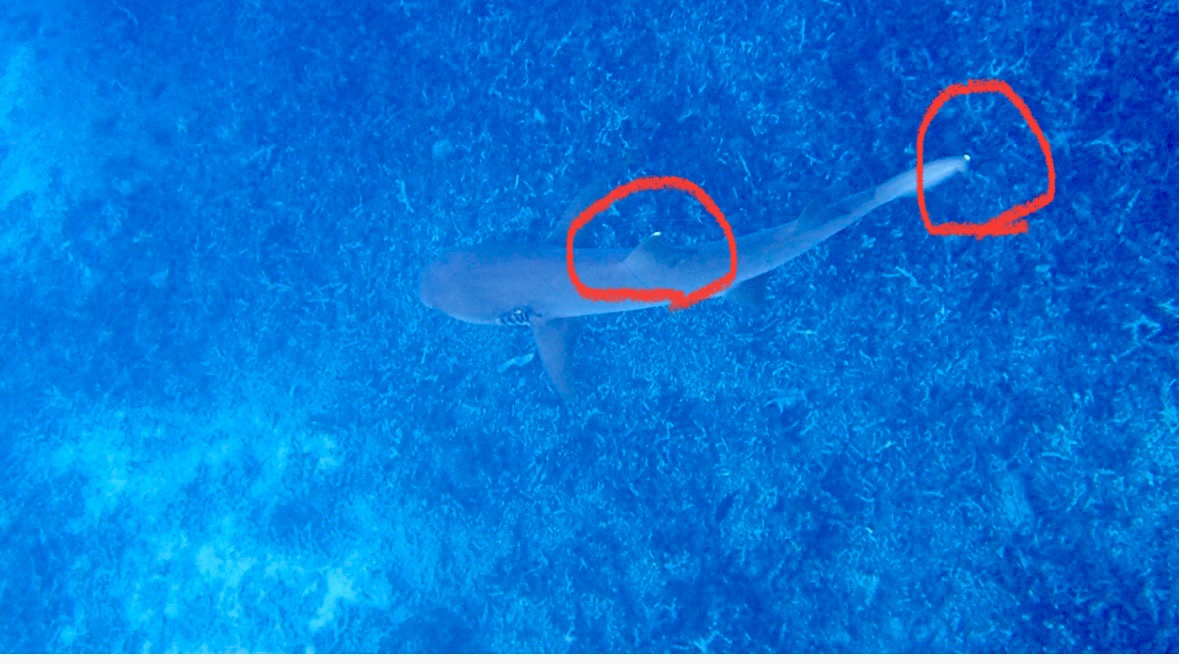 ホワイトチップシャークと呼ばれる理由は、写真の赤丸部分にある背びれと尾びれの先端が白いことからだそうです!